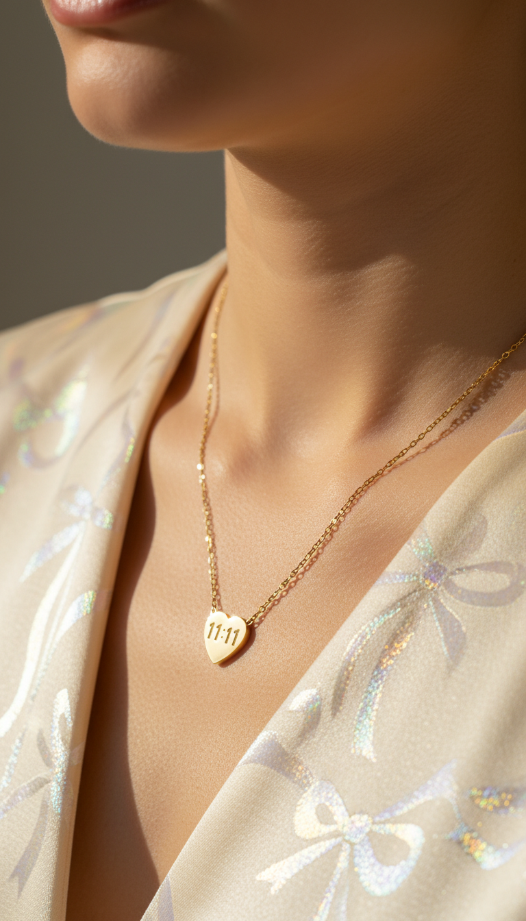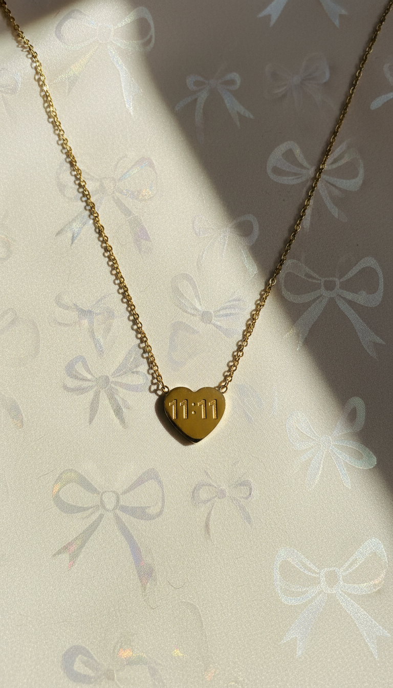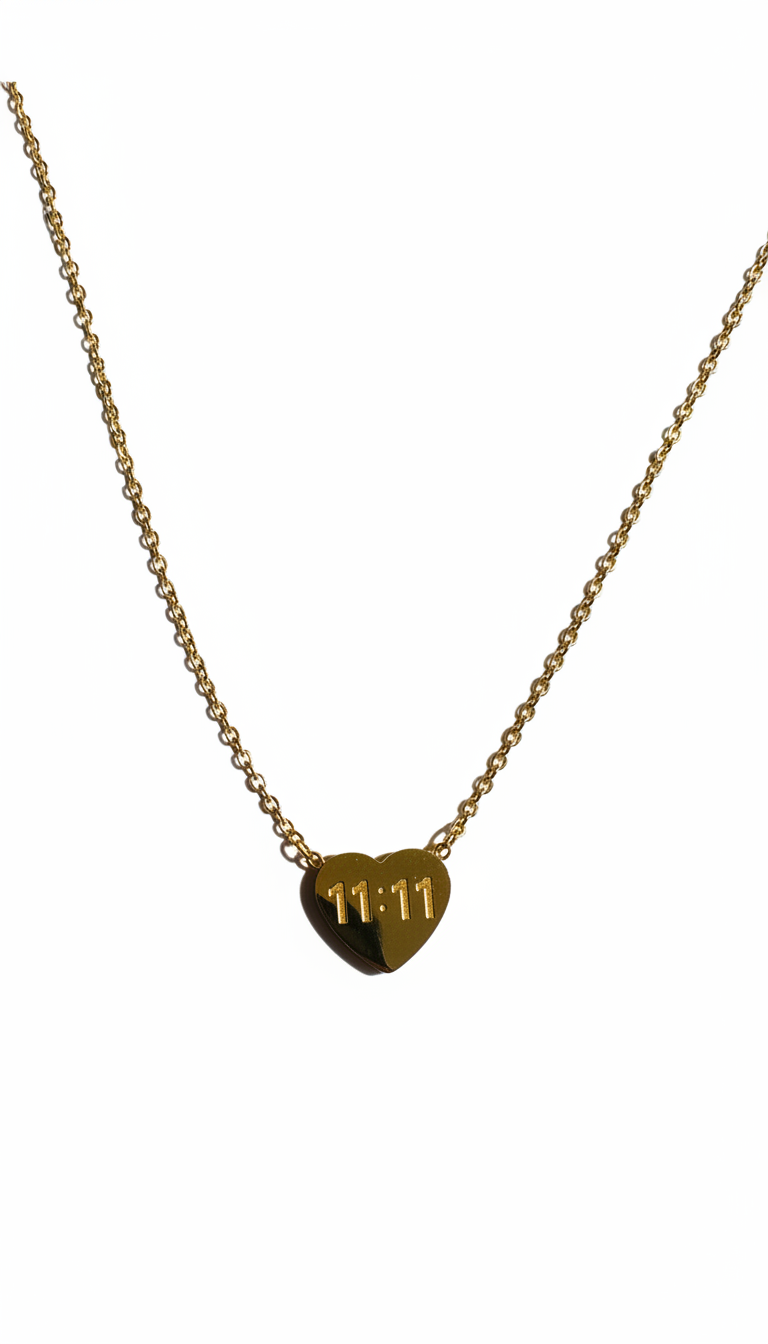 Crafted in a smooth gold-plated heart charm engraved with “11:11”, this necklace blends minimalist elegance with spiritual symbolism. The delicate fine chain keeps it lightweight and perfect for daily wear.