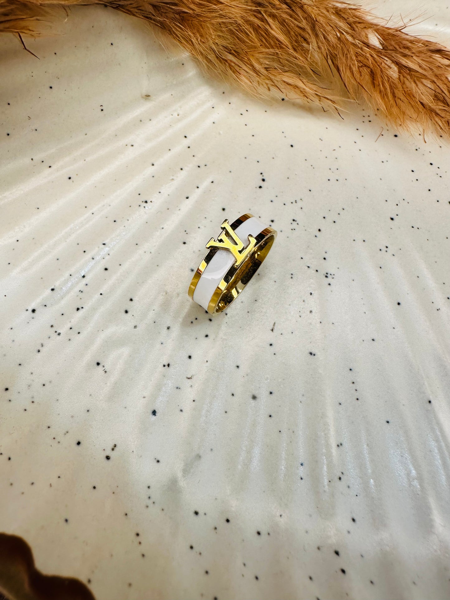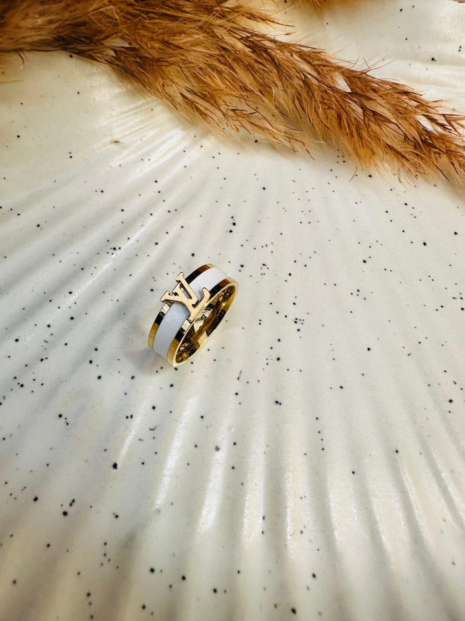 Upgrade your stack with our HeyBae Anti-Tarnish LV Ring, crafted with gold plating and a sleek white enamel band for a posh, designer-inspired look. Perfect for daily wear, festive styling, or statement western fashion, this ring keeps its shine—no tarnish, no dullness, no fuss.