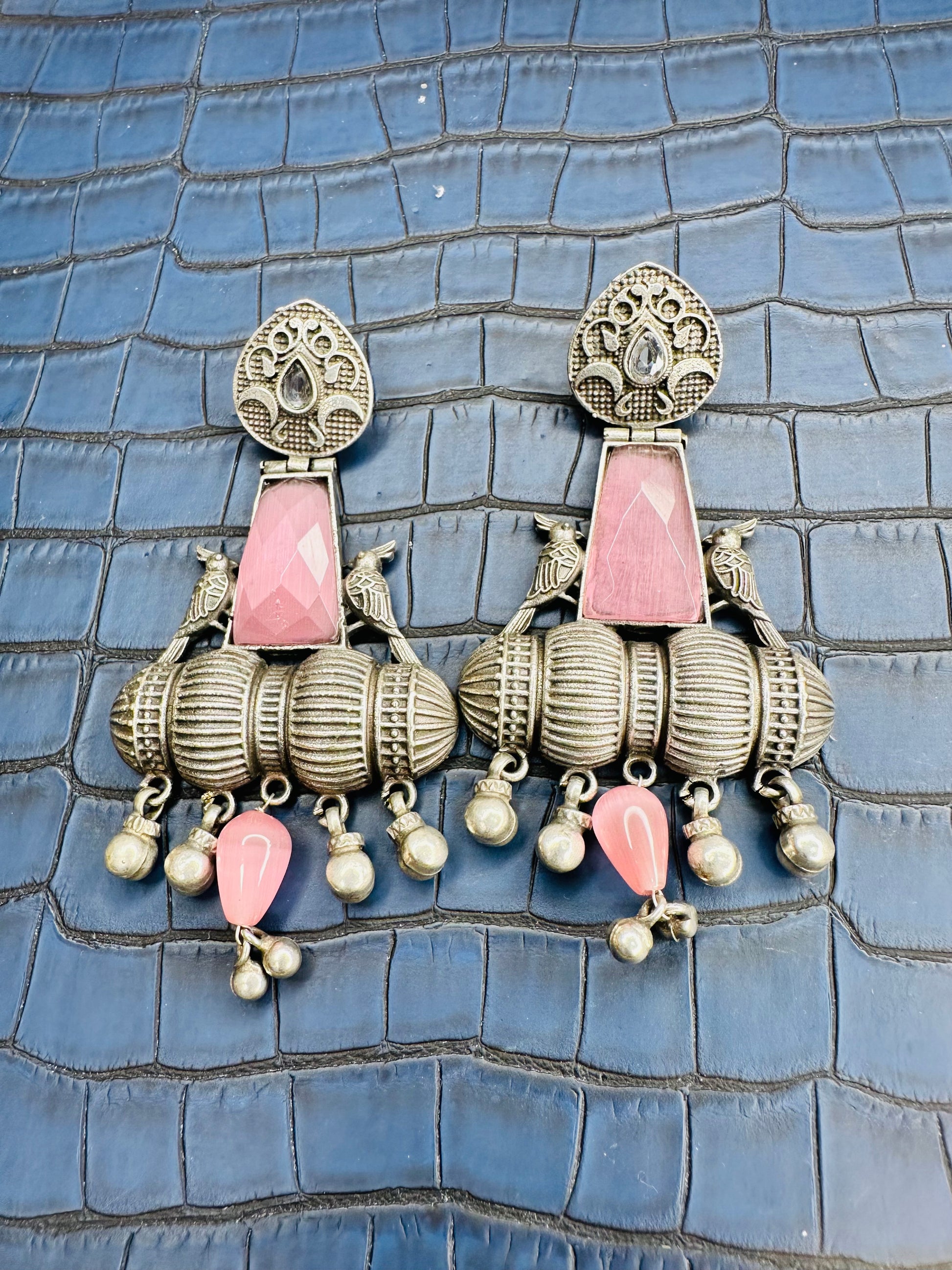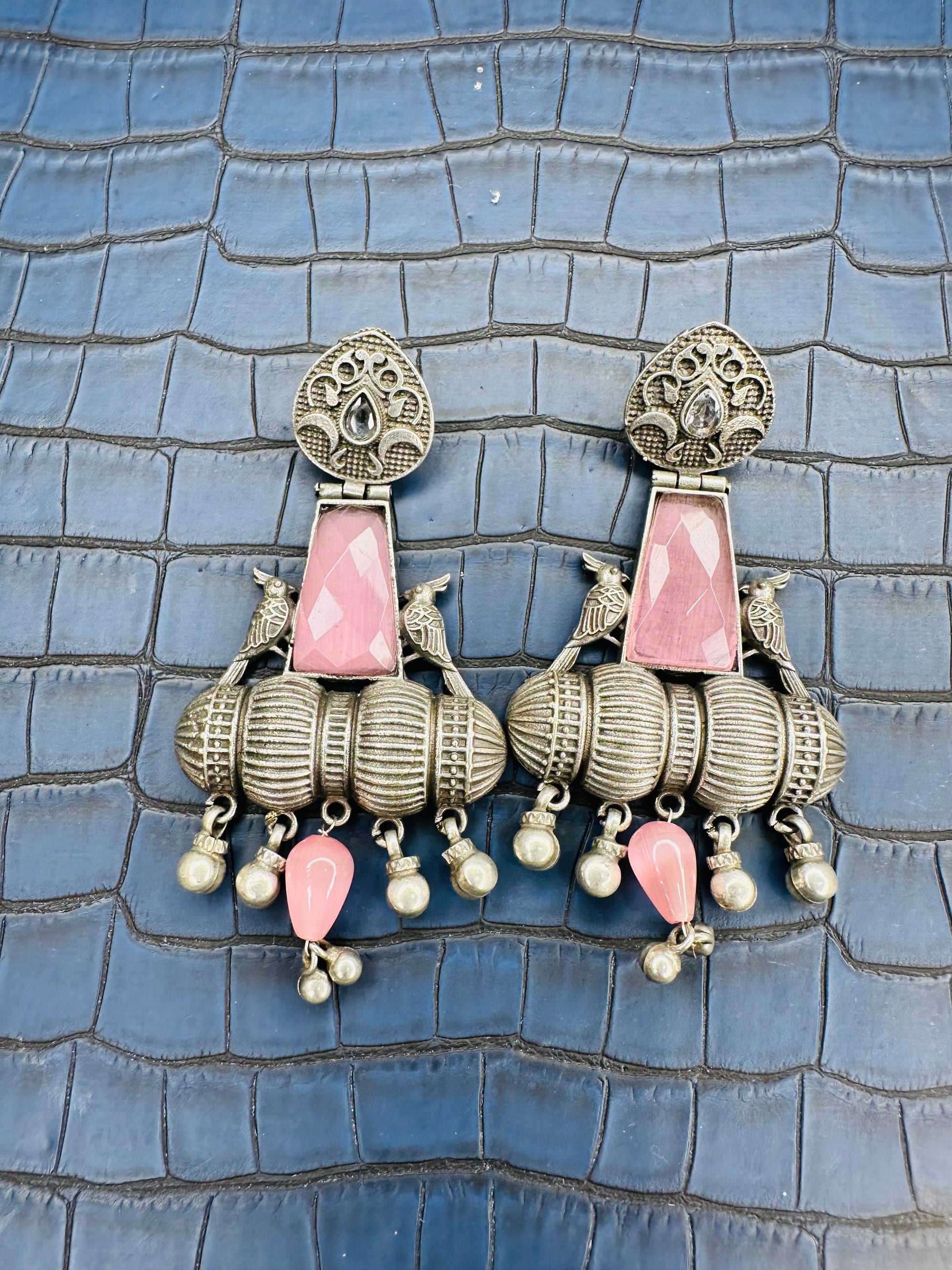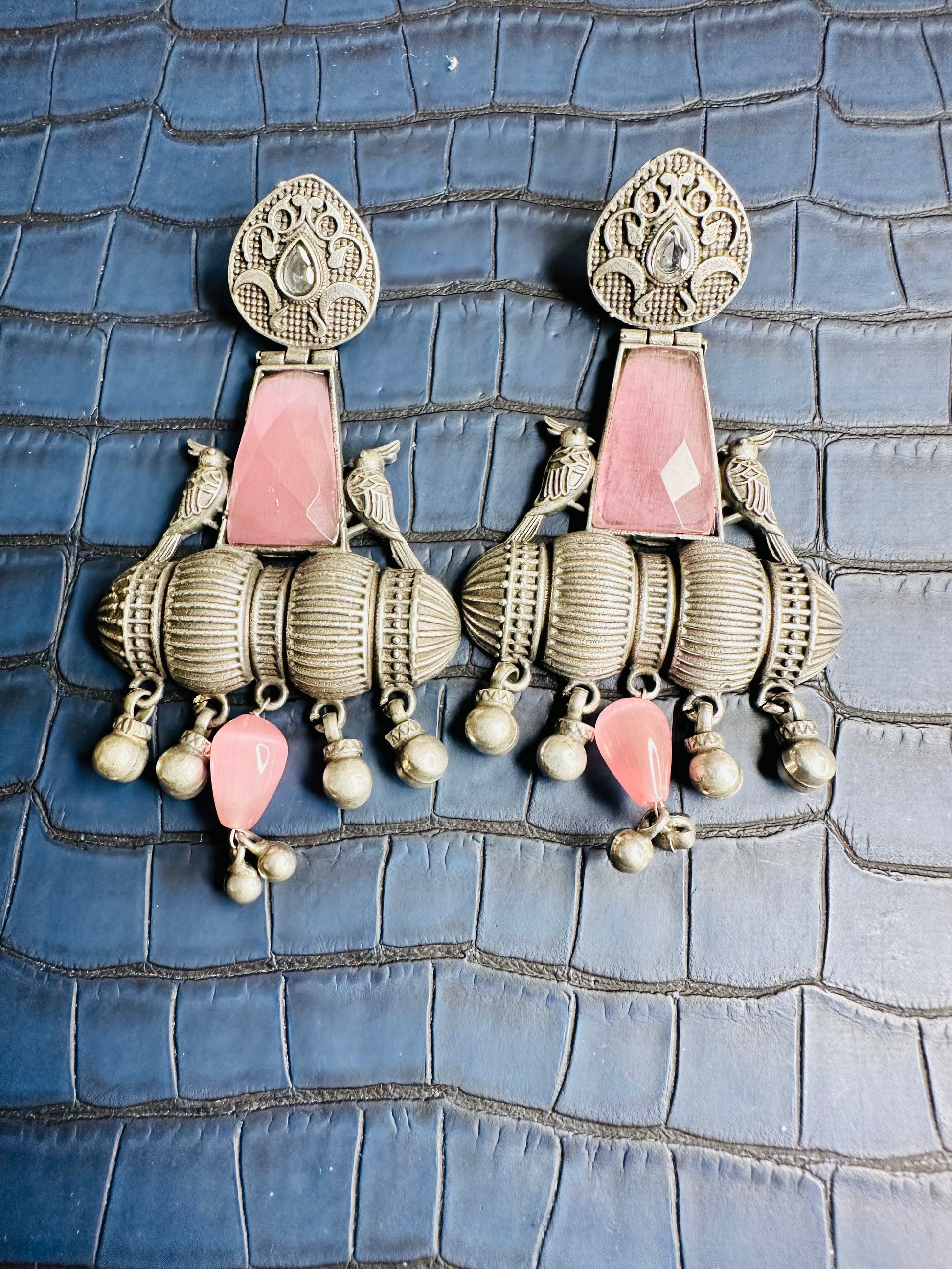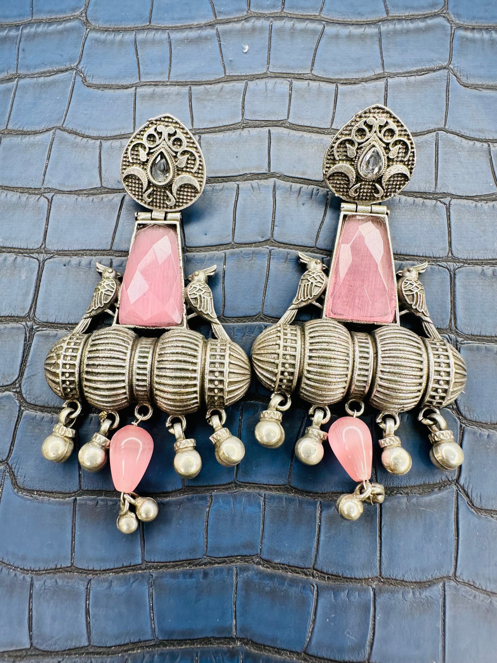 Oxidised Bird Design Earrings – Antique Silver Pink Drop Jhumkas