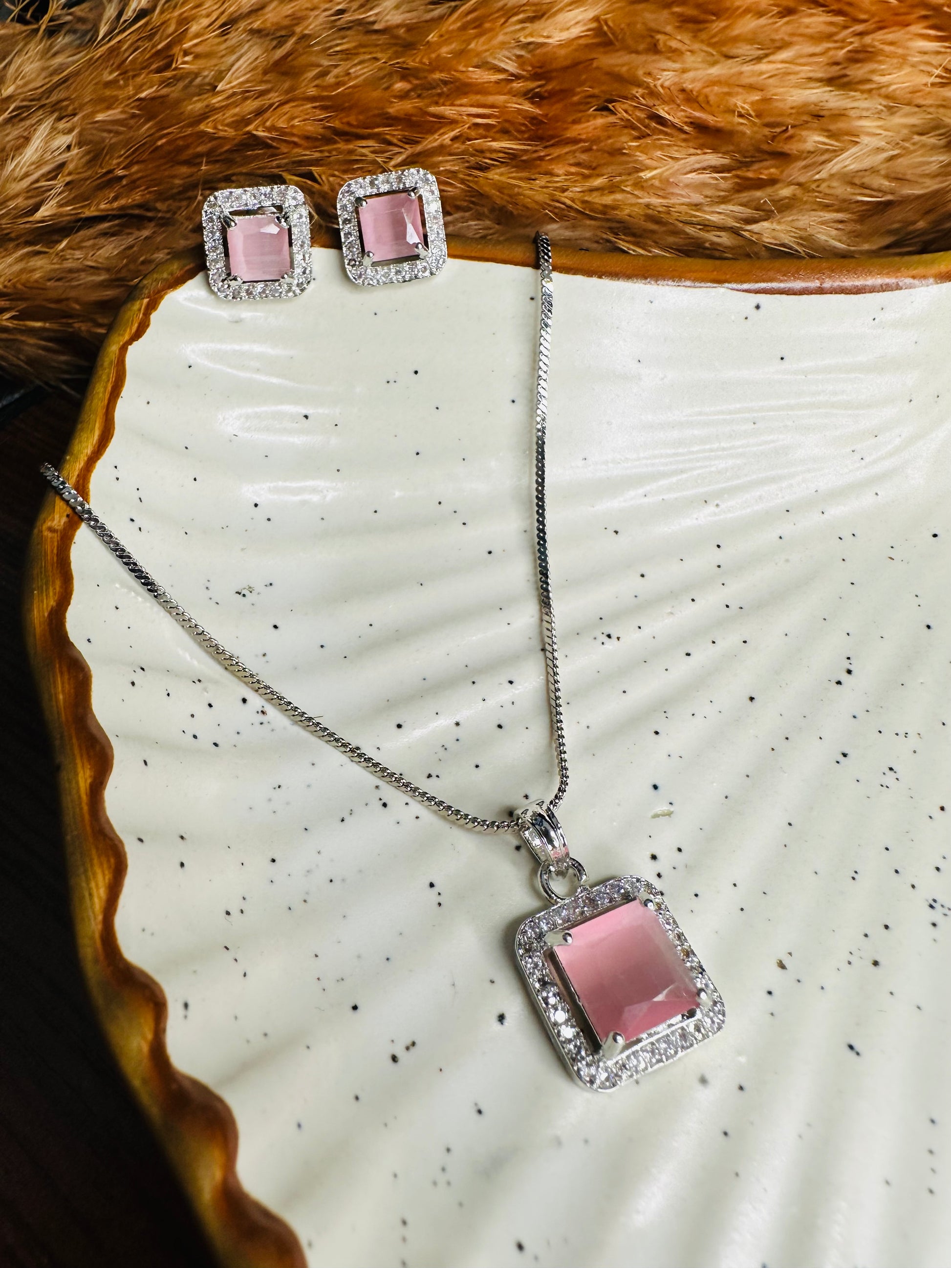 Pink Square Stone Necklace & Earrings Set – Crystal Halo Jewelry