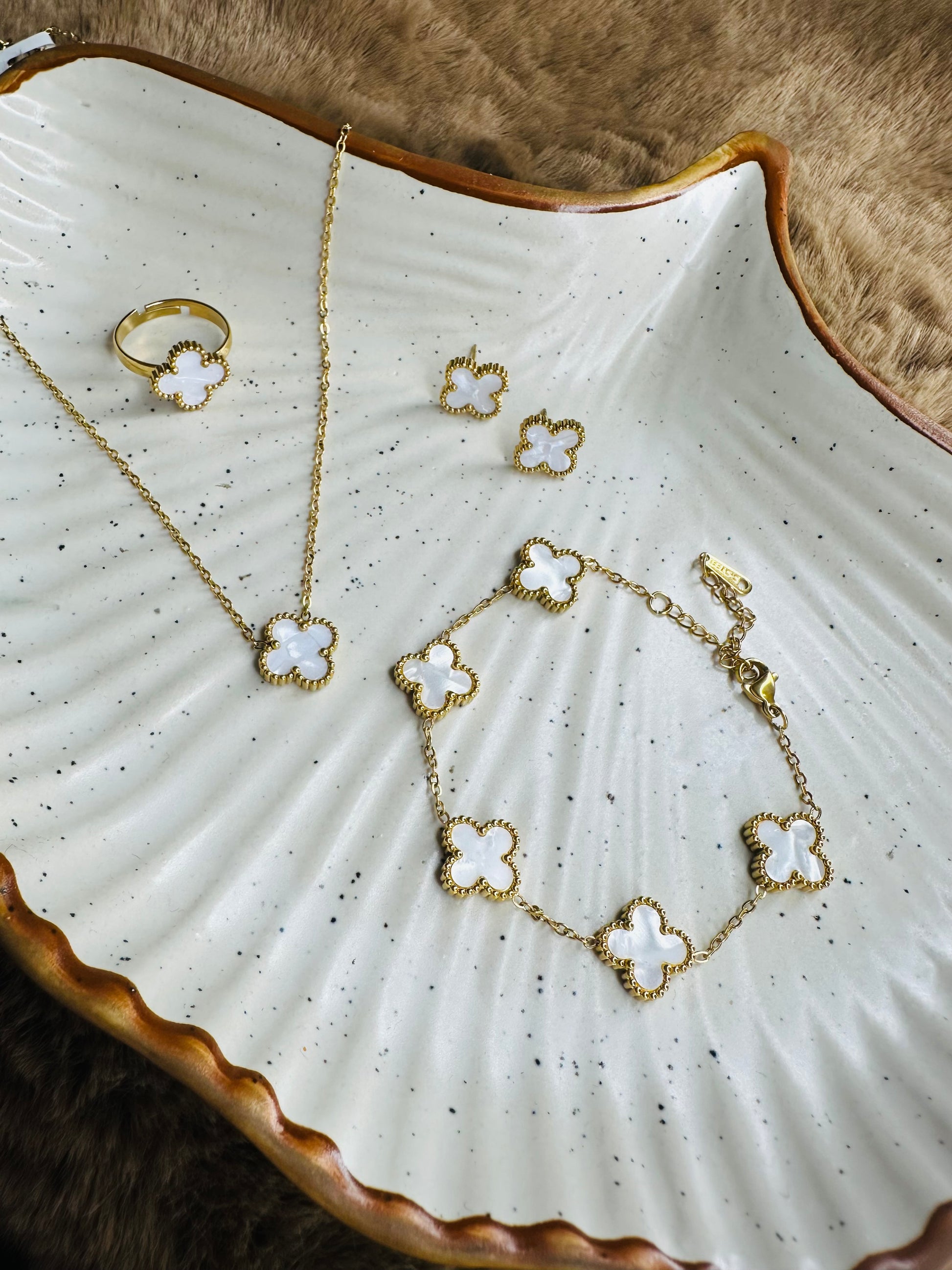 White Clover Jewellery Set – Necklace, Bracelet, Earrings & Ring