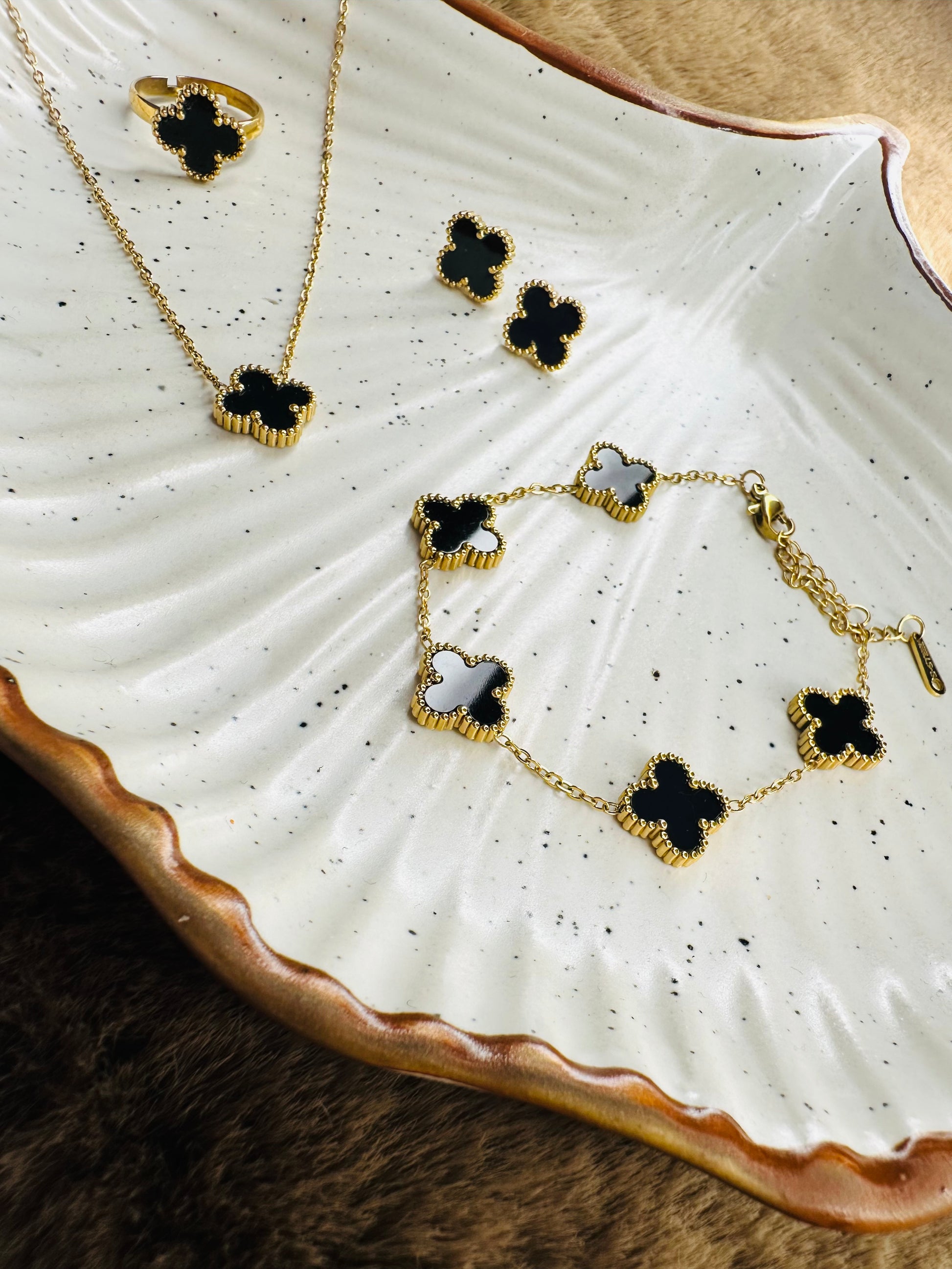 Elevate your jewelry game with the HeyBae Black Clover Jewelry Set, inspired by timeless luxury and sophistication. 🌟 This elegant set includes a pendant, earrings, ring, and bracelet, all designed with the iconic black, white, and gold clover motif — a universal symbol of elegance, grace, and good fortune.
